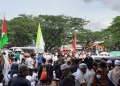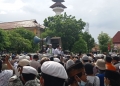 SERANG , BANPOS – Ribuan massa aksi yang tergabung dalam Forum Persaudaraan Umat Islam Banten (FPUIB) menggelar aksi unjuk rasa dalam bentuk parade bendera Tauhid. Dalam aksi tersebut, mereka mengkampanyekan beberapa isu, salah satunya yaitu isu hiburan malam yang marak di Kota Serang.