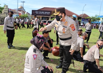 SERANG, BANPOS – Kapolres Serang, AKBP Yudha Satria, mandikan puluhan personel dengan kembang 7 rupa secara bergiliran di halaman Mapolres ...