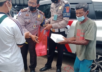 CIRUAS, BANPOS - Satuan Lalu Luntas (Satlantas) Polres Serang membagikan nasi kotak kepada sejumlah abang becak dan pengojek di simpang ...